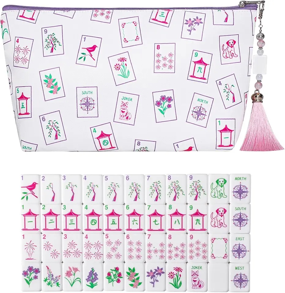 American Mahjong Game Set, 166 Premium White Tiles, 4 All-in-One Color Rack/Pushers, Complete Mahjong Set Blue Carrying Bag